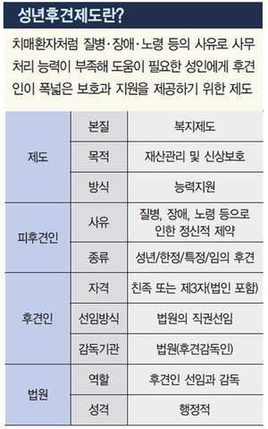 | 성년후견 | 판단능력이 ‘지속적’(예: 중증 치매, 중증장애 등)으로 결여된 경우. 법원이 심판 후 후견인 선임 |