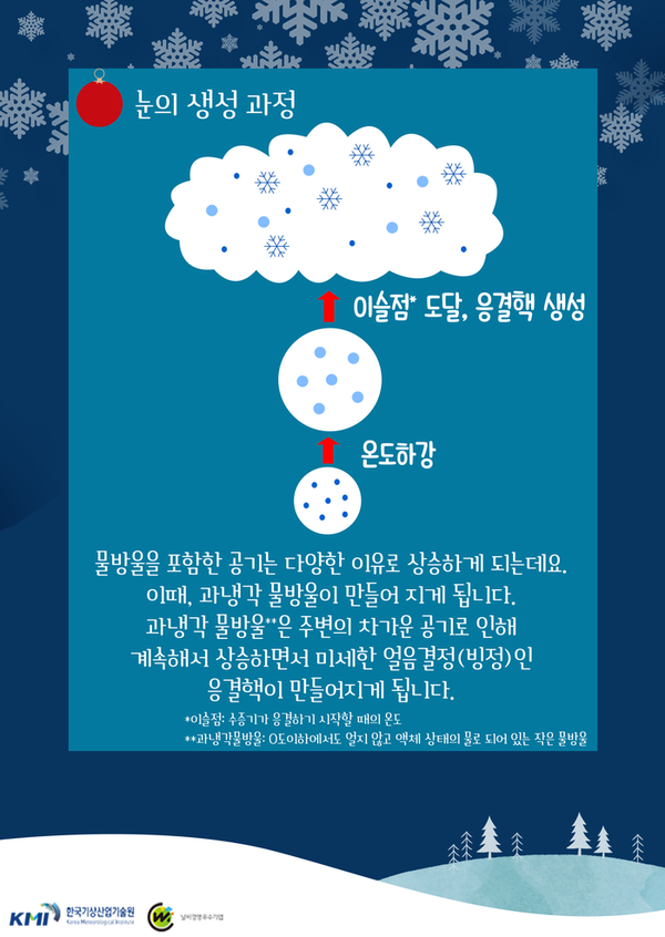 - 눈은 대기 중에 떠다니는 먼지, 소금, 박테리아 등 미세한 입자(응결핵 또는 눈핵)가 필수적입니다. 이 입자들은 수증기가 응결하거나 승화하여 얼음 결정이 자라는 '씨앗' 역할을 합니다.