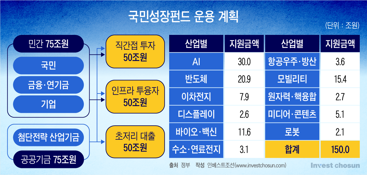 - 향후 5년간 150조 원 이상을 조성해 AI·반도체·2차전지·바이오·미래차·로봇 등 국가 핵심 전략 산업에 집중 투자하는 것이 목표입니다.
