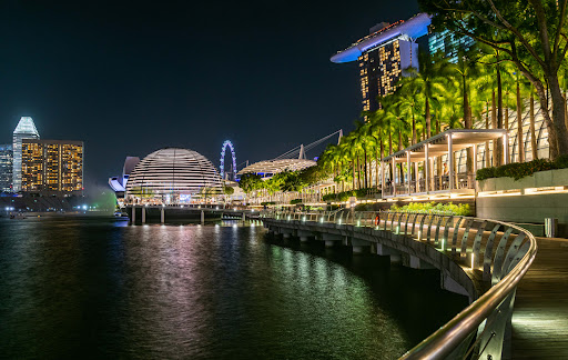 마리나 베이 주변을 따라 조성된 산책로. 야간 빌딩 조명과 헬릭스 브리지 등이 어우러지는 멋진 야경을 감상할 수 있음.