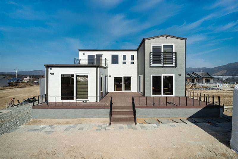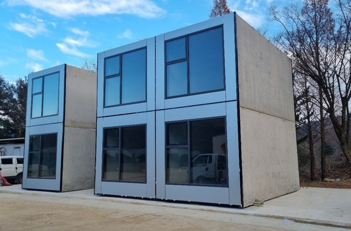 - 모듈 조립이 끝나면 창호, 문, 배선, 배관, 단열, 벽체 마감, 바닥 마감 등을 진행합니다.