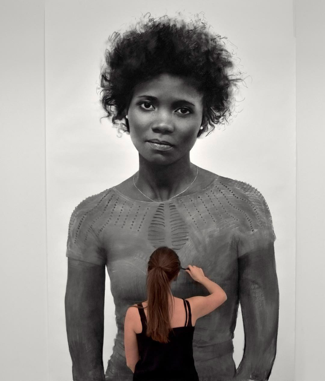 - 실제 크기 & 스케일 감상 — 그녀의 큰 숯 드로잉은 거의 사람 키에 맞먹는 크기여서, 가까이서 보면 디테일이 압도적이에요. 멀리서도 인물의 존재감이 강하게 느껴집니다.