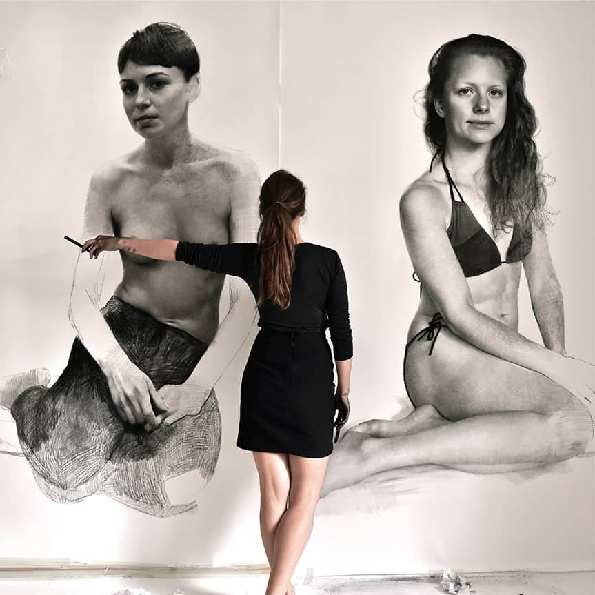 - 그녀는 커다란 스케일의 인물 드로잉과 회화를 전문으로 하며, 특히 흑백 목탄(charcoal), 색연필(color pencil), 유화(oil) 등을 사용해 매우 사실적인 인물화를 만듭니다.