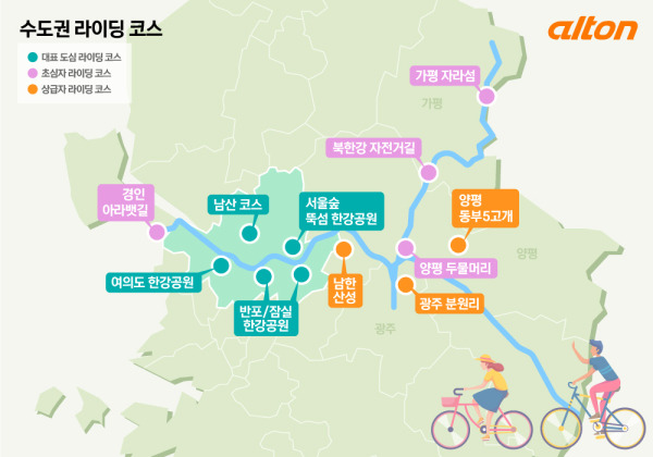 - 각 코스는 한강공원 내 자전거도로, 휴게소, 화장실, 대여소 등이 잘 갖춰져 있습니다.