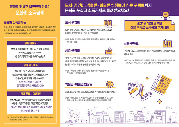 문화비 소득공제는 국민의 문화 향유를 활성화하고 문화산업을 지원하기 위한 제도입니다. 연말정산 시 근로소득자가 도서 구입비, 공연 관람비 등에 지출한 금액에 대해 추가로 소득공제를 해주는 방식입니다.