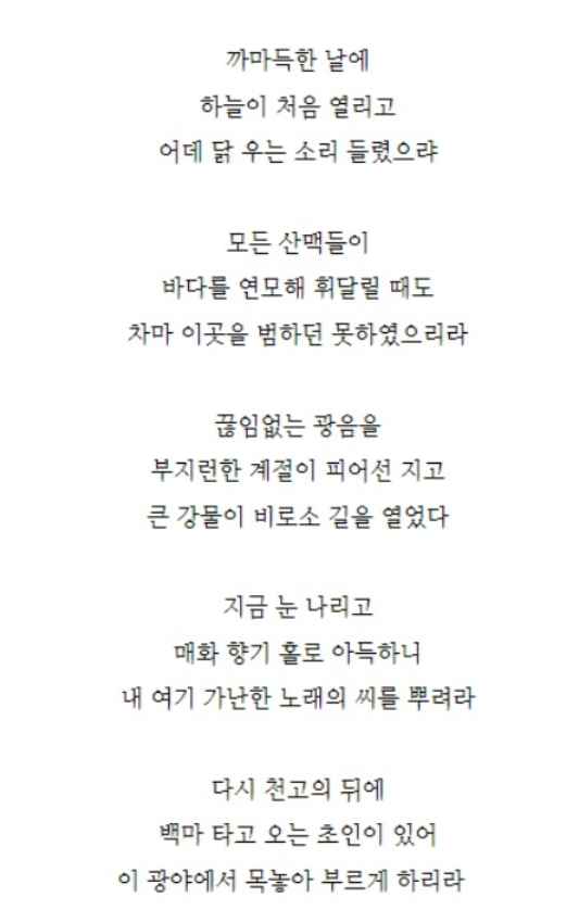 | 상징 요소 | 광야, 매화 향기, 초인, 노래의 씨 |