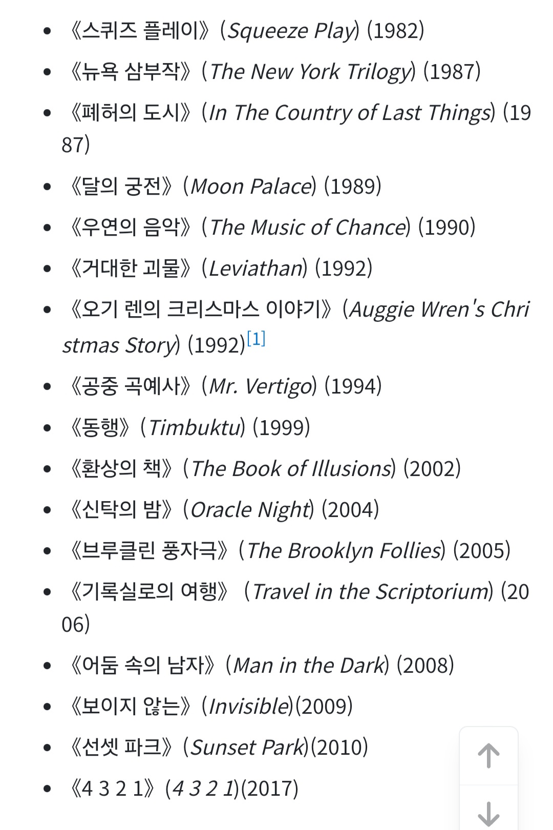 - 《달의 궁전》(Moon Palace, 1989): 한 청년의 여정을 통해 미국 사회와 인간 존재의 의미를 깊이 탐색.