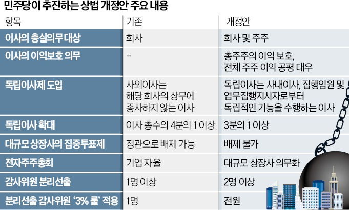 더불어민주당이 5일 꺼내든 상법 개정안은 그동안 당내에서 추진한 법안 중 가장 강력하다는 평가가 나온다. 소액주주 보호를 강화하지만 그만큼 최대주주와 경영진에 부담이 될 수 있다는 얘기다. 개정안은 이사의 충실의무를 회사에서 주주까지 확대하는 기존 민주당 추진 방안에 최대주주의 감사 선임 권한을 제한하고 법안 유예 기간도 축소했다. 민주당은 이재명 대통령이 대선 과정에서 “취임 2~3주 안에 상법 개정안을 처리하겠다”고 공언한 만큼 속도전으로 밀어붙인다는 계획이다.