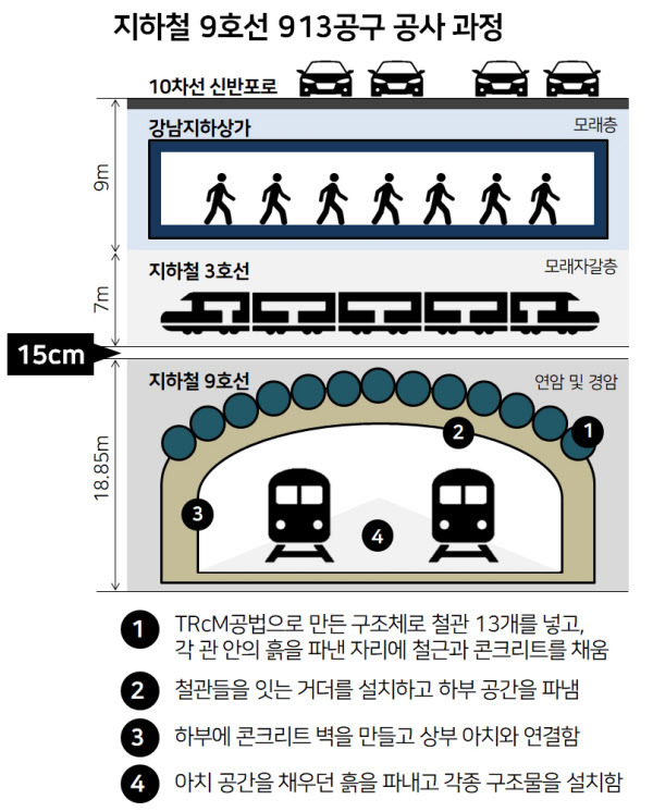 - 이 강관들을 서로 연결하는 강력한 거더(보)를 설치하고, 강관과 거더가 일체화되도록 철근을 배근하고 콘크리트를 타설하여 매우 견고한 아치형 천장 구조물을 완성했습니다. 이 과정에서 3호선 바닥 구조물과의 간격이 단 15cm라는 초정밀 시공이 요구되었습니다.