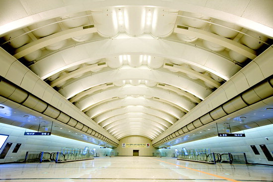 9호선 고속터미널역에서의 구체적인 적용: TRcM 공법으로 만들어진 상부 지지 구조물 아래에서, 9호선 고속터미널역의 넓은 승강장 공간을 만들기 위해 CAM 공법이 적용되었습니다.