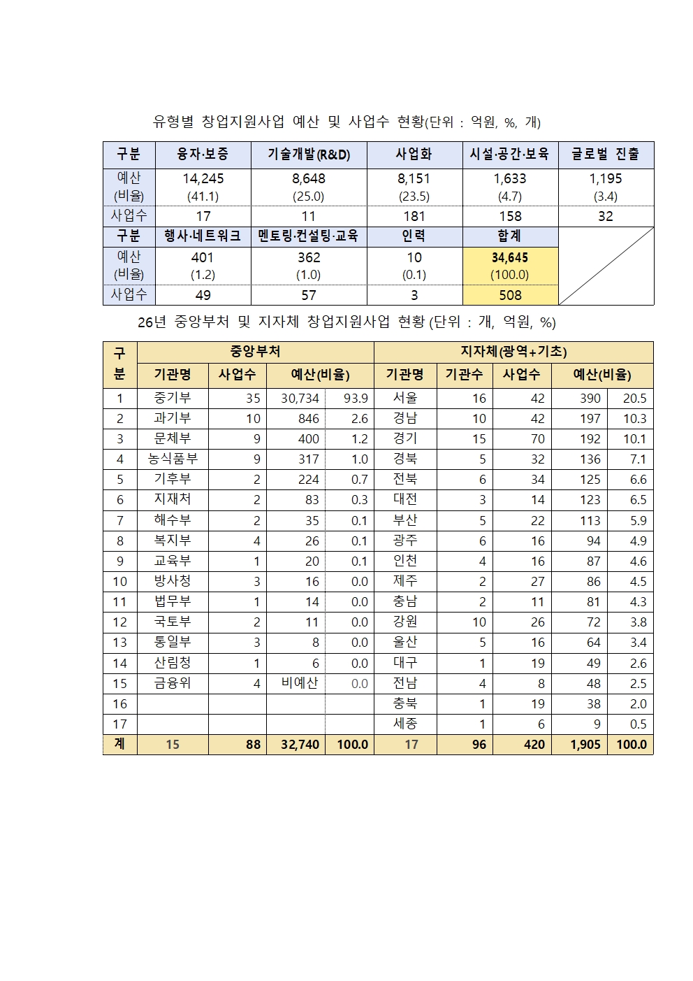 - 2026년 중앙부처·지자체 창업지원사업 통합 예산: 총 3조 4,645억 원(전년 대비 약 5.2% 증가).